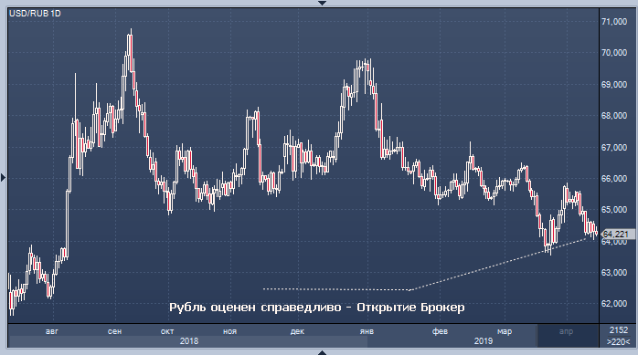 Текущая стоимость рубля является справедливой, считает начальник отдела глобальных исследований Открытие Брокер Тимур Нигматуллин. Это несмотря на то, что аналитик считает близким к завершению сформировавшийся в начале марта тренд на укрепление российской валюты. Эксперт отмечает, что текущая цена рубля включает пересмотр ожиданий усиления санкций после публикации законопроекта DASKA-2019. Этому способствовало признание "усталости" Конгресса США от антироссийских санкций. Также уже проявили себя в котировках рубля сезонное сокращение внешних платежей и carry trade нерезидентов в ОФЗ на ожиданиях снижения ключевой ставки ЦБ РФ на одном из ближайших заседаний. Эти факторы «почти полностью отыграны и заложены в текущий курс». Дальнейшему росту рубля будет препятствовать "бюджетное правило" Минфина РФ, который планомерно скупает с открытого рынка валюту на поступающие в бюджет средства от продажи нефти выше стоимости $40 за баррель. Переломным моментом станет разрешение торгового спора между США и Китаем. Переговоры близки к завершению. Трамп, по слухам, идёт на существенные уступки, чтобы добиться заключения сделки уже в ближайший месяц.