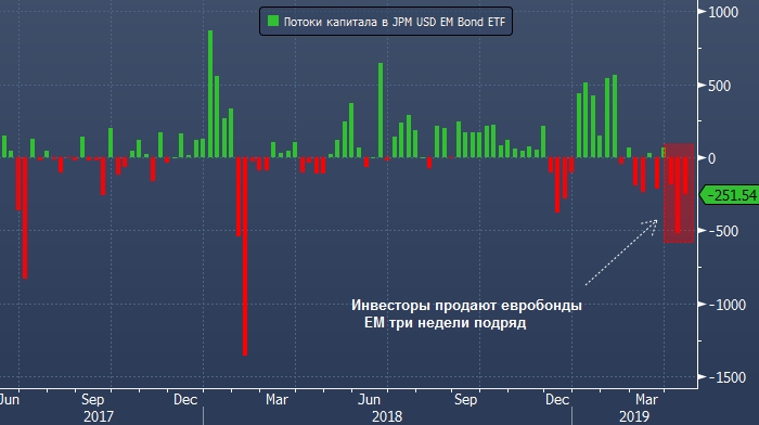 По данным агентства, на прошлой неделе из крупнейшего индексного фонда, ориентированного на евробонды EM (iShares JPMorgan USD EM Bond ETF), был выведен $251 млн, а неделей раньше - еще $516 млн, что по совокупности составило почти 5% всех его активов. Отток капитала фиксировался в 6 из последних 8 отчетных периодов.