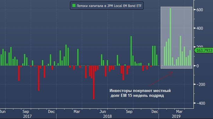 При этом аналогичный индексный фонд, ориентированный на «местный» долг развивающихся стран (iShares JPMorgan EM Local Government-Bond ETF), фиксирует приток средств 15 недель подряд. С начала года объем его активов вырос на $2.6 млрд, тогда как его долларовый конкурент сумел привлечь ровно в 2 раза меньше - $1.3 млрд.