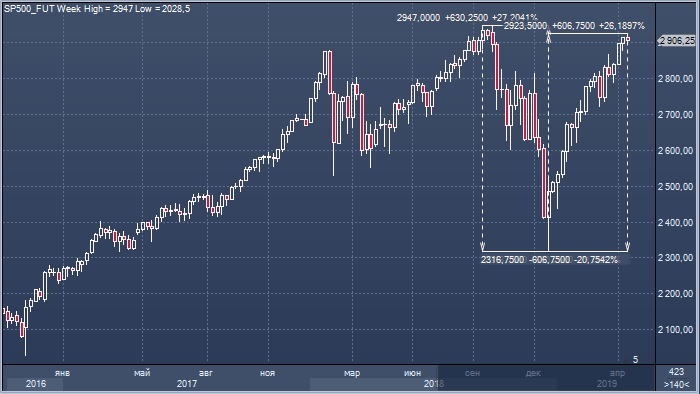Последний квартала 2018 года для американского индекса широкого рынка S&P 500 стал худшим за 7 лет. Падение в декабре было стремительным. В какой-то момент оно составляло более 20%. С тех пор фьючерсы на индекс S&P 500 выросли на 26%, но все еще торгуются ниже максимумов конца 2018 года. При этом индекс волатильности Cboe — показатель «уровня страха» на Wall Street — на прошлой неделе достиг самого низкого уровня с октября.