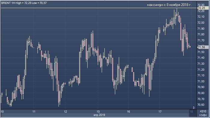 Цены на нефть по итогам торгов в среду 17 апреля немного снизились. Brent ушел в красную зону на 0.15% до $71.61 за баррель, WTI подешевел на 0.47% до $63.75 за баррель.