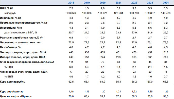 В базовый сценарий ведомство заложило постепенное снижение цен на нефть до конца 2019 года. Оценка среднего уровня цены на нефть за 2019 год сохранена на уровне 63.4 за баррель. Дальнейшая траектория цен на нефть также сохранена без изменений: ожидается снижение до 59.7 за баррель в 2020 году и 53.5 за баррель к 2024 году.