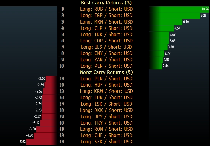 Это самый высокий показатель среди всех валют мира, а также драгоценных металлов, которые отслеживает агентство. На втором месте египетский фунт. Carry-стратегии с этой валютой при условии использования доллара США в качестве валюты фондирования принесли бы 9.29% годовых. Тройку лидеров замыкает мексиканское песо с куда менее привлекательной доходностью 6.10% годовых.