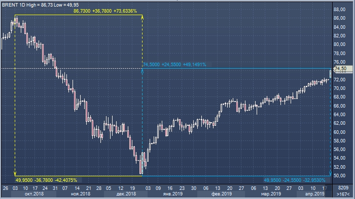 В понедельник 22 апреля резкий взлет цен на нефть оказал поддержку рублю, позволив ему добиться вышеперечисленных рекордных достижений. Котировки Brent взлетели более чем на 3% и достигли максимума с 1 ноября 2018 года на уровне 74.50 за баррель.