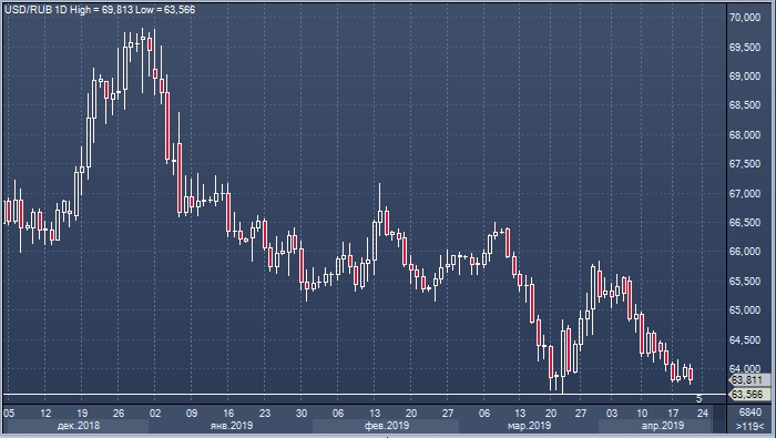 Курс USDRUB в первый торговый день текущей недели сформировал минимум 63.74 за единицу американской валюты. При этом котировки в этой валютной паре пока еще остаются выше минимума 2019 года, который был сформирован 22 марта на уровне 63.57.