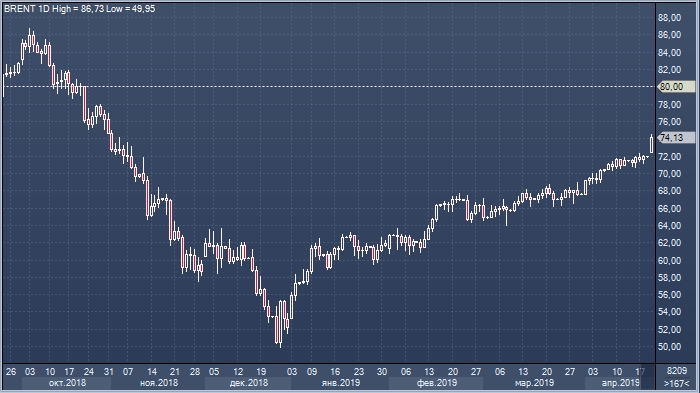 На фьючерсном рынке котировки достигли пика на уровне $74.50 за баррель и подумывают проверить на прочность круглую цифру $75 за баррель на фоне решимости США со 2 мая полностью изгнать Иран с мирового экспортного рынка «черного золота».
