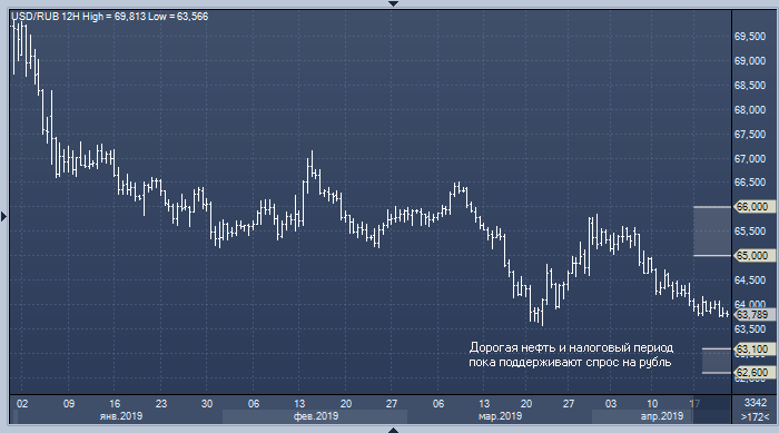 В ближайшей перспективе курс доллара к рублю продолжит снижаться, и первой целью является область 62.6-63.1, полагает начальник отдела экспертов по фондовому рынку «БКС Брокер» Василий Карпунин. Однако, по его мнению, укрепление российской валюты окажется непродолжительным, и после окончания налогового периода доллар/рубль может вернуться к 65-66.