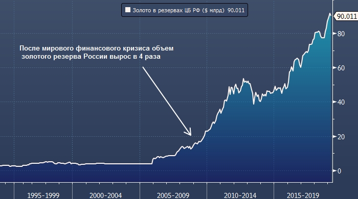 Напомним, что за последние десять лет РФ увеличила свои золотые резервы в четыре раза.