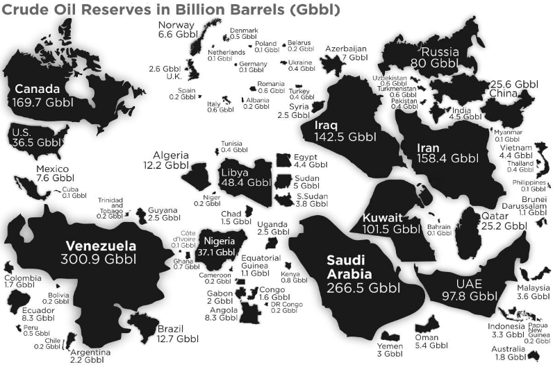 Ресурс HowMuch нарисовал карту мира, отобразив на ней страны с наибольшими запасами нефти. Размер страны на карте пропорционален объему ее запасов черного золота. Рисунок составлен на основе данных CIA World Factbook.
