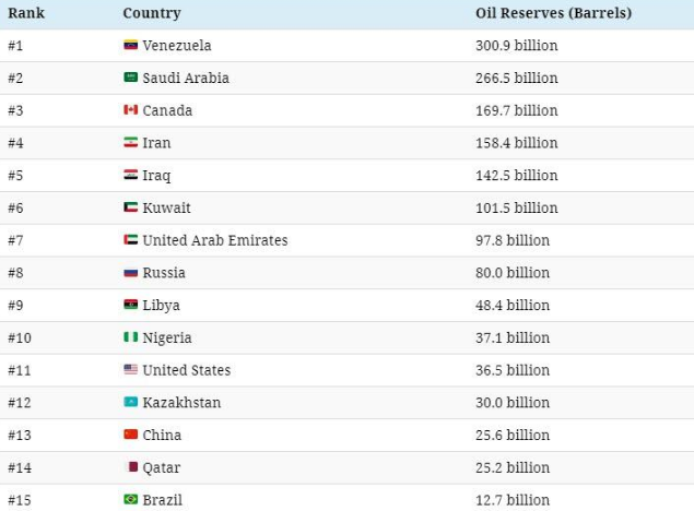 Наибольшими запасами нефти обладают Венесуэла, Саудовская Аравия, Канада, Иран и Ирак. Россия — восьмая в списке.