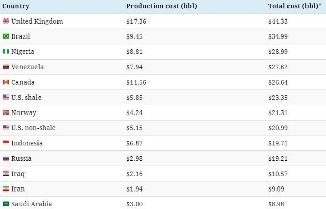Впрочем, сам по себе абсолютный объем запасов нефти не так важен, как себестоимость ее добычи. Дешевле всего добывать черное золото в Иране: здесь себестоимость добычи барреля нефти составляет всего $1.94. Наиболее высок этот показатель в Великобритании ($17.36), а Россия занимает третье место в списке стран с наименьшей себестоимостью добычи ($2.98), уступая лишь Ирану и Ираку.