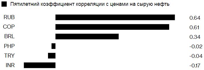 Российский рубль и колумбийское песо больше всего выиграли от недавнего роста нефтяных цен, отмечают эксперты Bloomberg. Российская валюта продемонстрировала самую высокую положительную взаимосвязь с нефтью. Коэффициент корреляции в пятилетнем базисе составил 64%. Колумбийская валюта немного уступает по этому показателю — +61%.