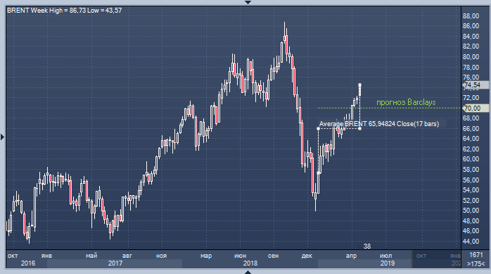 В Barclays отмечают, что с начала года и по настоящий момент средняя цена нефти марки брент составляет $65. В банке ранее озвучивали прогноз, согласно которому это значение по итогам 2019 года составит $70 за баррель, однако теперь предупреждают о риске того, что цены окажутся выше. В Barclays считают, что в дорогой нефти США следует винить самих себя — ужесточение позиции в отношении Ирана в условиях, когда на рынке и так не хватает тяжелых сортов «чёрного золота», а ОПЕК, а точнее Саудовская Аравия, не спешит компенсировать выпадающие баррели, создает благоприятные условия для быков.