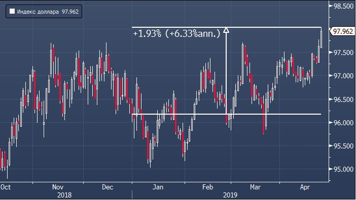 В то же время индекс доллара к корзине из 6 основных валют вырос до 98.03 пункта. Это пик с 18 мая 2017 года. С начала текущего года доллар укрепился к своим основным конкурентам на 1.93%, хотя в конце 2018-го многие эксперты пророчили ему слабость. В первую очередь, по отношению к евро. Кстати, в преддверии 2018 года большая группа аналитиков также пророчила доллару падение, но по итогам 12 месяцев он вырос.