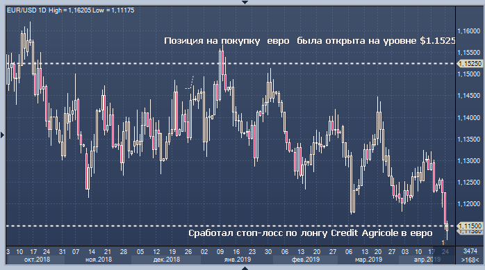 Банк дал рекомендацию открывать позицию на покупку евро на уровне $1.1525 на спотовом рынке 11 января. С того времени евро подешевел более чем на 3%; к 17:42 мск он торговался по $1.1146. Ранее сегодня евро обновлял минимум 2019 года и минимум с июня 2017 года, достигнув уровня $1.1117. Сегодня сработал стоп-лосс Credit Agricole, который был выставлен на уровне $1.1150.