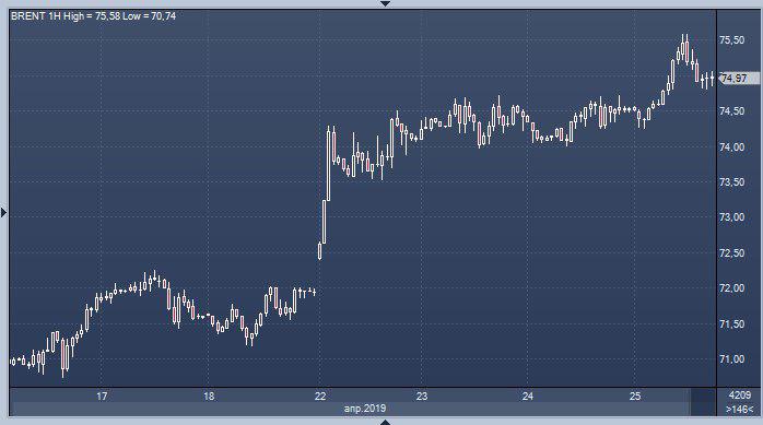 Стоимость фьючерсов на нефть марки Brent в четверг 25 апреля впервые в 2019 году превысила 75 за баррель и достигла суточного пика 75.60 за баррель. Это максимум с 31 октября 2018 года.
