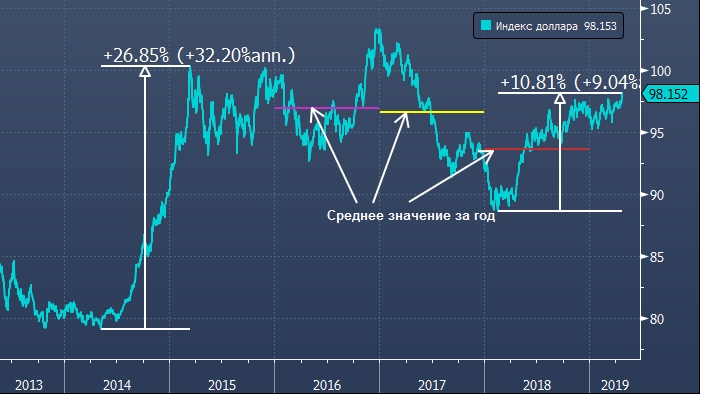 К примеру, в период стремительного роста в 2014 и 2015 году индекс доллара достиг на пике своего в тот момент 12-летнего максимума. Но более важно, что среднее значение за год тогда выросло на 17% г/г. В итоге в 2016 году ФРС США пришлось отложить повышение ставок, поскольку заметно подорожавший доллар сдерживал экспорт и негативно влиял на рост инфляции за счет сокращения импортных цен.
