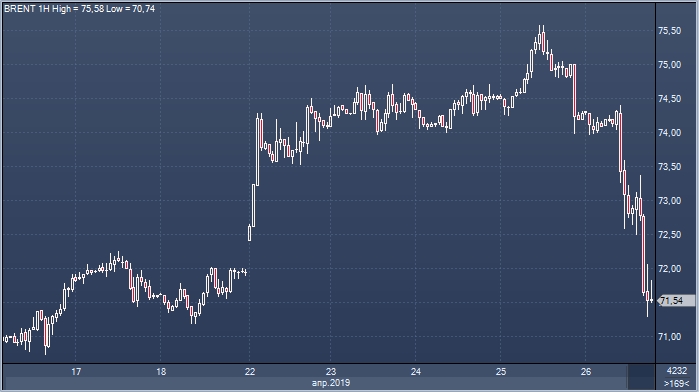 Цены на нефть завершают неделю значительным падением. Котировки Brent в пятницу 26 апреля снизились на 3.77% до 71.55 за баррель. Цена WTI упала на 3.93% до 62.66 за баррель.