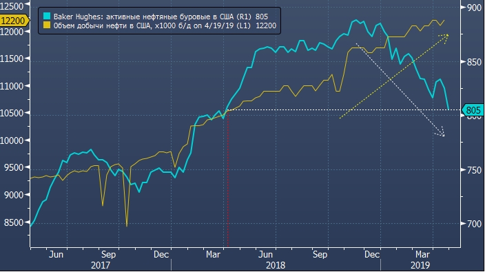 Таким образом, нефтяные буровые упали до минимумов с 6 апреля 2018 года. На предыдущей неделе (до 19 апреля) число нефтяных установок сократилось на 8 до 825 шт.