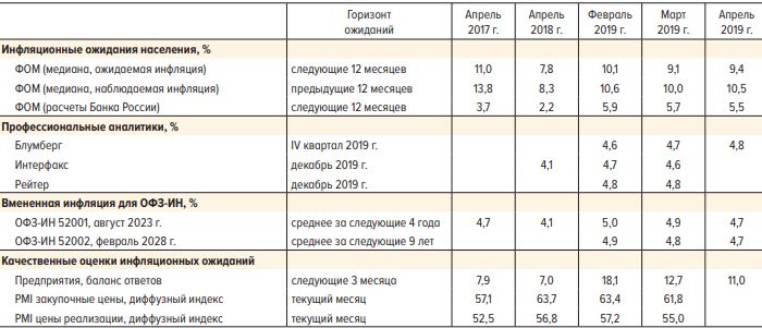 Диапазон прогнозов инфляции экономистами Интерфакс, Bloomberg и Thomson Reuters с января остается практически неизменным — 4.6–4.8% годовых. По их мнению, инфляционное ускорение в начале текущего года является временным явлением. С текущего квартала инфляция должна постепенно снижаться и достигнуть 4% годовых в 1 квартале 2020 года.