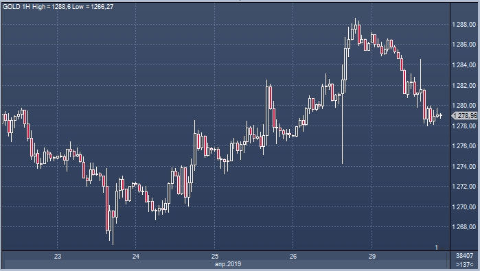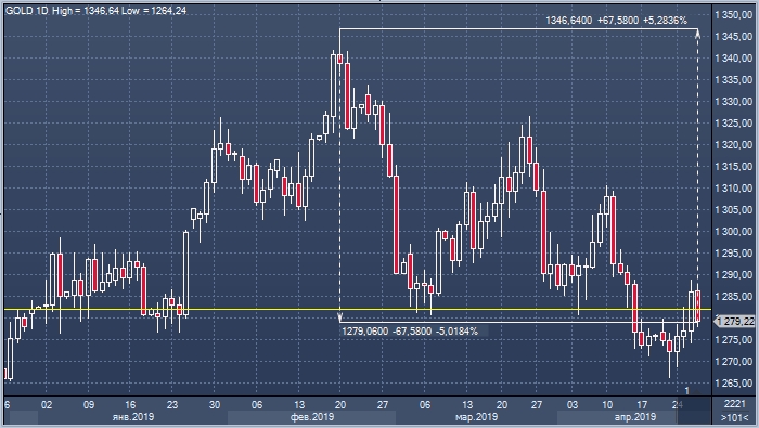 Цены на золото на торгах в пятницу 26 апреля достигли 10-дневного максимума на уровне $1 288 за тройскую унцию, но в понедельник 29 апреля они стабильно снижались в течение всего торгового дня и опустились до $1 278 за унцию.