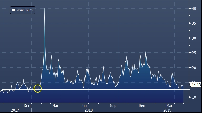 Сейчас индекс волатильности VIX, который выступает мерой ожидаемой в течение ближайших 30 дней волатильности индекса S&P 500, находится на самом низком уровне с октября. Европейский аналогичный индекс VDAX торгуется на минимумах с января 2018 года.