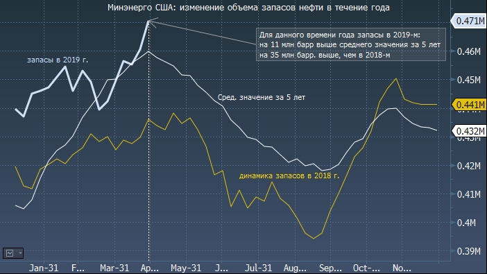 При этом за отчетную неделю до 26 апреля запасы нефти выросли на 9.93 млн. Это максимальный недельный прирост с 2018 года. При этом общая величина запасов выросла до 470.567 млн баррелей, что является самым высоким значением с сентября 2017 года.