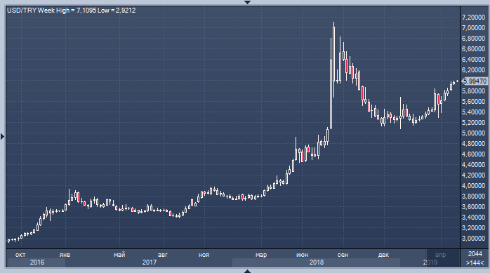 Турецкая лира остается в числе главных аутсайдеров валютного рынка, и сегодня курс USDTRY подскочил до уровней выше 6.00 и достиг максимальной отметки с октября 2018 года. Повод для роста активности продавцов оказался тот же, что и многих других активов — жесткая риторика Дональда Трампа, давшая участника рынка повод для сомнений относительно заключения торгового соглашения с Китаем. В то же время давление на лиру создает и неопределенность в вопросе с выборами в Турции: верховный избирательный совет страны должен в ближайшее время решить оставлять ли в силе итог выборов в Стамбуле, где победил представитель оппозиции, или же внять призывам президента страны Эрдогана и провести повторные выборы. Учитывая, что в отношении более чем 100 человек власти начали расследования по делу о возможном мошенничестве в ходе подсчета голосов и увидели у ряда из них связь с Фетуллахом Геленом, члены совета, вероятно, не станут искушать судьбу.