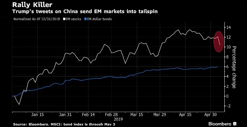 Активы стран с развивающейся экономикой выросли в этом году в основном благодаря двум допущениям: Федеральный резерв США не будет поднимать ставки, а торговые переговоры между Вашингтоном и Пекином будут постепенно продвигаться к соглашению. Два твита от президента США Дональда Трампа в воскресенье разрушили последнее, отправив развивающиеся рынки в штопор. Даже несмотря на то, что первое все еще остается в силе.