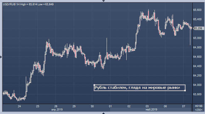 То есть можно сделать предположение, что пока Китай не ответит США равноценным повышением пошлин, то есть пока торговая война не выйдет на новый более опасный уровень, рынки будут сохранять веру в прогресс на переговорах и спокойствие. Поэтому курс рубля, поглядывая на внешний рынок, позабыв о внутренних факторах поскольку в России продолжаются длительные майские каникулы, когда многие трейдеры и инвесторы предпочитают не торговать, также сохраняет стабильность.