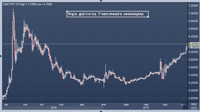 Валюта Турции упала до самого низкого уровня с октября, в то время как ее облигации также оказались под давлением после решения избирательного совета страны аннулировать выборы мэра в Стамбуле, что обострило опасения инвесторов. Во вторник лира упала на 1.7%, доведя ее до TL6.1961 к доллару США, продлив снижение понедельника и вернувшись к уровням, невиданным с момента последнего валютного кризиса, который произошел летом 2018 года. Падение вторника увеличило размеры падение за последние два дня до 3.34%, показывают данные Refinitiv.