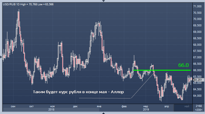 «Среднесрочные прогнозы на российскую валюту печальные, что связано прежде всего с политикой наших монетарных властей на ослабление курса рубля, в том числе и за счет покупок валюты на открытом рынке. Вероятность ослабления рубля в район 66 за доллар до конца мая очень велика», — полагает аналитик Алор Брокер Алексей Антонов.