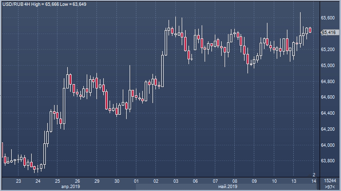 Рубль в понедельник полноценно отыгрывал все события майских праздничных дней, поскольку три торговых дня прошлой неделе российская валюта преимущественно следила за динамикой цен на нефть. Котировки Brent в первой половине дня 13 мая росли более чем на 1%, но вечером (на момент написания статьи) падают на 1.04% до $61.03 за баррель.