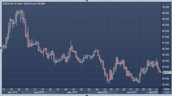 Рубль продолжает наступление на доллар и евро с открытием торгов в валютной секции Московской биржи в четверг 16 мая. При поддержке цен на нефть, которые ко вчерашнему закрытию торгов прибавили 0.44% (Brent) и 0.58% (WTI), курс USDRUB снижается на 0.24% до 64.49, а курс EURRUB — на 0.21% до 72.30.