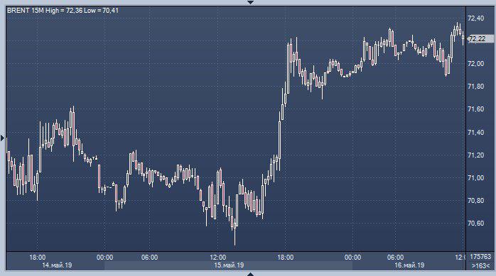 Brent целенаправленно движется к тому, чтобы реализовать самый крупный еженедельный прирост за последние 6 недель. В четверг 16 мая котировки фьючерсов этого североморского сорта выросли на 0.39% до $72.24 за баррель.