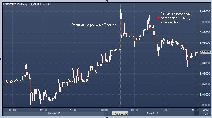 Удар со стороны Трампа был неожиданным, и обеспечил импульс для рывка USDTRY выше 6.09. Однако к настоящему времени турецкая валюта сумела оправиться от понесенных потерь — спасением для неё стало сообщение Reuters о том, что правящая партия решила отказаться от идеи передать около 40 млрд лир из резервов центрального банка Министерству финансов. Ранее новости о таких планах правительства крайне негативно сказались на настрое инвесторов, породив опасения, что средства будут использованы на покрытие дефицита бюджета. В январе регулятор уже передавал Минфину Турции 37 млрд в национальной валюте из своей прибыли, однако дефицит бюджета, несмотря на вливания, за первые четыре месяца 2019 года достиг 54.5 млрд лир, при том что официальный прогноз правительства предполагает, что по итогам года он составит 80.6 млрд.