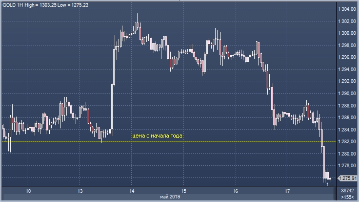 Драгоценные металлы заметно подешевели на торгах в пятницу 17 мая. Котировки золота вновь опустились ниже уровней начала года. Желтый металл упал на 0.77% до $1.276 долларов за тройскую унцию. При этом серебро упало в цене в пятницу на 0.95% до $14.42 за унцию. Снижение с начала года составляет почти 7%. В то же время палладий снизился на 1.2%, а платина на 1.93% до $1317 и $814 за унцию соответственно.