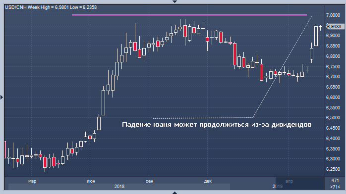 Китайский юань, уже пострадавший от торгового спора с США, вскоре получит еще один катализатор для снижения. Согласно расчетам Bloomberg, китайские компании, зарегистрированные в оффшорных зонах, будут продавать юань для покупки иностранной валюты и финансирования дивидендных выплат своим акционерам на сумму 18.8 млрд долларов, которые должны быть произведены с июня по август. Хотя это меньше, чем в прошлом году — 19.6 млрд. долл. США — платежи придутся на сложное время: юань находится на самом низком уровне в этом году, а спекуляции — что он упадет до 7 за доллар, уровня, который считается ключевым психологическим рубежом — нарастают.