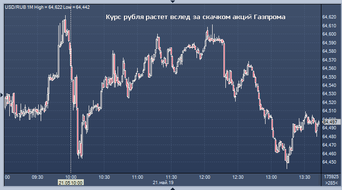 Рубль развернул наверх вслед за нефтью и российским фондовым рынком, где акции Газпрома взлетели до максимумов 2011 года на фоне решения о выплате солидных дивидендов. Российскому газовому монополисту улыбнулась удача в виде конфликта США и Китая, следствием которого стало решение Пекина повысить пошлины на американский СПГ. Индекс МосБиржи, один из основных российских фондовых индикаторов, впервые в своей истории превысил рубеж 2600 пунктов на фоне взлета акций Газпрома до 207 рубля за штуку, максимума с июля 2011 года. Совет директоров утвердил рекомендацию годовому собранию акционеров выплатить дивиденды за 2018 год в размере 16.61 рубля на акцию.