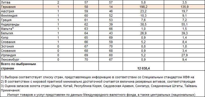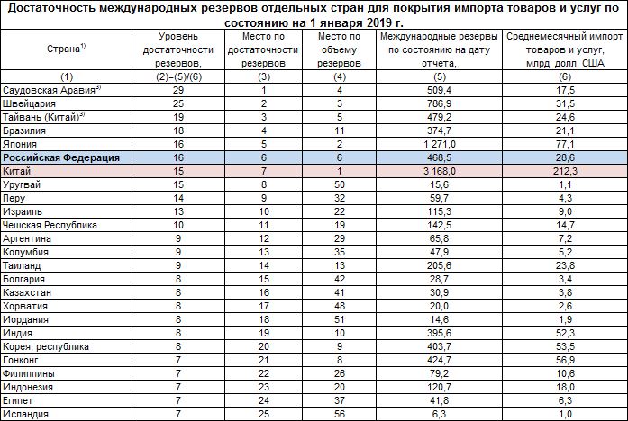 Россия в этом списке находится на 6 позиции: с учетом среднемесячного импорта в размере 28.6 млрд, 468.6 млрд резервов хватит на 16 месяцев.