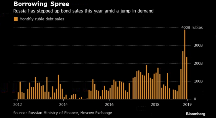Экономисты Morgan Stanley считают, что рекордные продажи российского государственного долга в этом году позволят стране противостоять более жестким санкциям США в отношении суверенных облигаций, если риски таковых материализуются. В среду Россия продлила серию чрезвычайно успешных аукционов по размещению долговых обязательств, разместив облигаций на 73 млрд рублей (1.1 млрд долларов США) с погашением в 2024 году и 23.3 млрд рублей с погашением в 2030 году. Министерство финансов продало долговых бумаг в 2019 году уже на 1.2 трлн больше, чем общий объем размещений 2018 года, что позволяет министерству рассмотреть вопрос о сокращении первичного предложения во второй половине года.