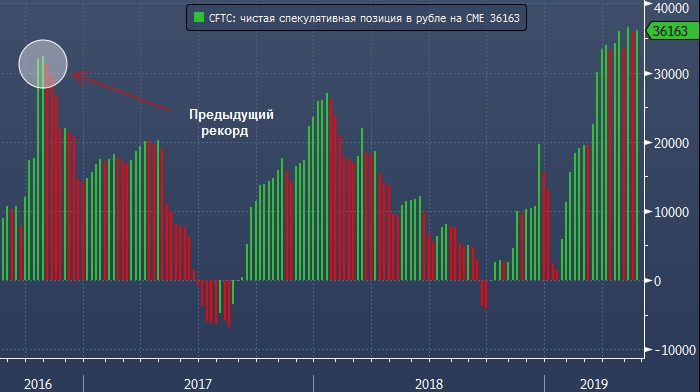 В октябре 2016 года объем чистой длинной спекулятивной позиции в рубле достиг рекордного значения в 32 339 фьючерсных контрактов, однако тогда этот показатель оставался выше отметки 30 000 лишь три недели подряд.