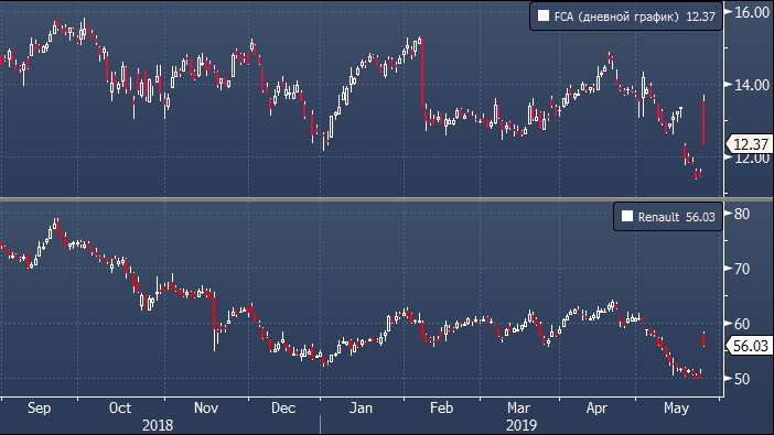 Fiat Chrysler Automobiles сделал Renault предложение о слиянии на сумму в 32.6 млрд евро. В результате сделки, которая полностью будет оплачена акциями, будет сформирован концерн с объемом продаж в 8.7 млн автомобилей в год, выручкой почти 170 млрд евро и чистой прибылью свыше 8 млрд евро. Также ожидается, что за счет синергии компаниям удастся сэкономить свыше 5 млрд евро. В новом автогиганте, который станет третьим по величине в мире, у FCA и Renault будет по 50%, при этом акционеры FCA до закрытия сделки получат дивиденды в объеме около 2.5 млрд евро — конечная сумма будет зависеть от различий в рыночной стоимости акций двух компаний.