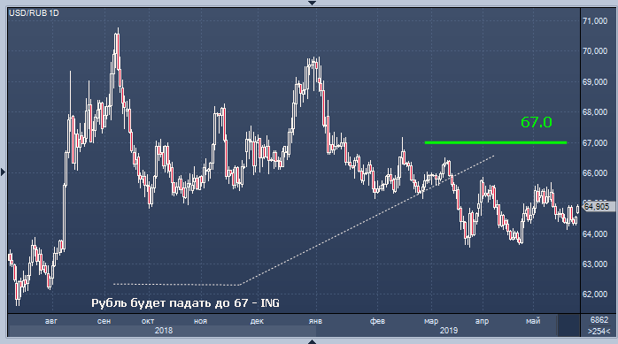 ING сохраняет осторожный взгляд на рубль в связи с предстоящими дивидендными выплатами и считает, что он упадет до 65–67/$ в ближайшие месяцы. Динамика 2012–2018 годов свидетельствует, что в среднем рубль слабеет в мае—августе на 8%. В этом году в мае—августе компании выплатят около 2 трлн руб. дивидендов, 31% этой суммы, или 0.6 трлн руб., может быть конвертировано в валюту Наибольшая часть выплат приходится на июль. Во втором квартале рубль показывает лучшую динамику, чем ожидалось, что объясняется притоком нерезидентов в ОФЗ и более сильным, чем ожидалось, сальдо текущего счета.