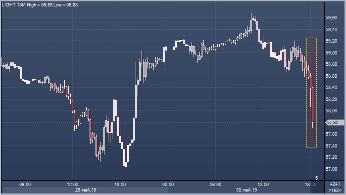 Котировки июльских фьючерсов на нефть WTI снижаются в качестве реакции на публикацию отчета Минэнерго США об изменении запасов нефти и нефтепродуктов за неделю до 24 мая.