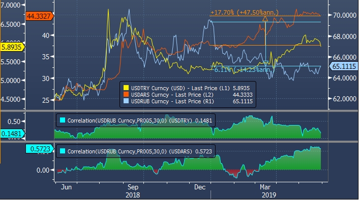 Эмпирические оценки аналитиков Goldman предполагают, что курс рубля может оказаться под давлением, если упадет курс лиры или курс песо (или двух валют сразу). Аналогичные выводы делаются в отношении южноафриканского рэнда и колумбийского песо. Эти валюты также живо реагируют на динамику турецкого и аргентинского конкурента.
