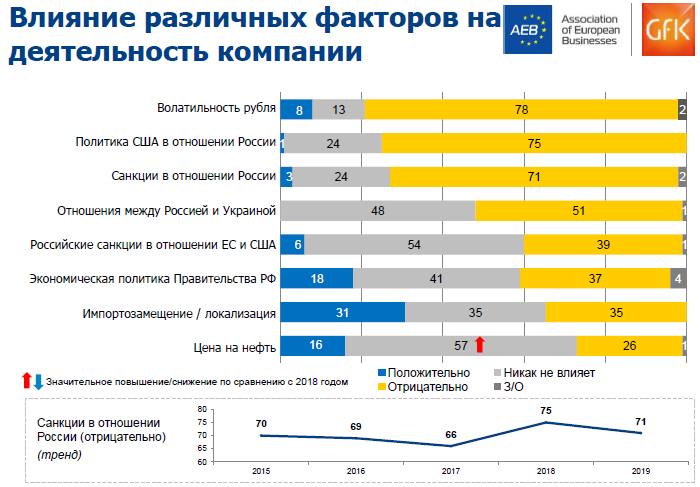 В качестве наиболее серьезных препятствий для ведения бизнеса в России участники опроса назвали нормативные ограничения (65%), отсутствие квалифицированного персонала (30%) и недостаточную надежность цепочки поставок (28%). Кроме того, европейцы недовольны качеством входных материалов, технологической отсталостью производственных мощностей и плохой работой коммунальных служб.