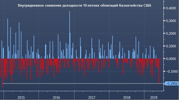 На обострение торговых отношений рынок отреагировал увеличением спроса на безопасные активы. В результате доходность 10-летних облигаций Казначейства США по итогам пятницы упала на максимальную величину с 2014 года.