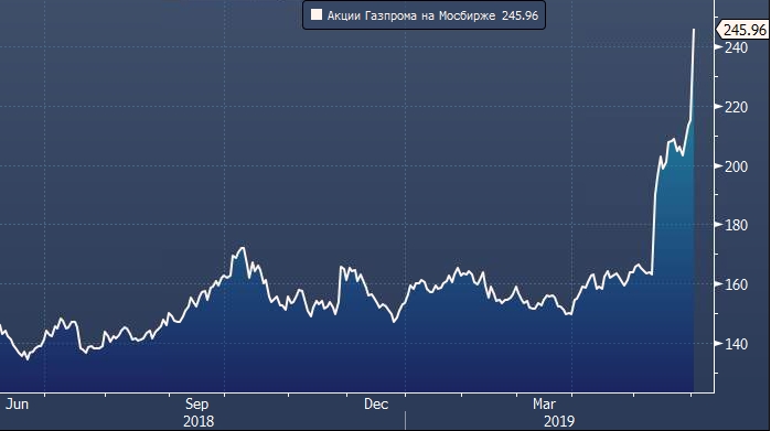 Рублевый индекс Мосбиржи впервые в истории забрался выше 2700 пунктов, долларовый индекс РТС преодолел психологически значимый уровень в 1300 пунктов — впервые с февраля 2018 года. И все это на фоне сильнейшего падения мировых фондовых индексов и цен на нефть на опасениях разрастания торговых войн Трампа. Рынок растет за счет продолжающейся несколько недель агрессивной скупки акций Газпрома, которые сегодня выстреливали 251.65, максимум с 11 апреля 2011 года. Индекс Мосбиржи к 13:11 мск понедельника рос на 2.78%, до 2740.65 пункта, индекс РТС — на 2.61%, до 1320.62 пункта. Бумаги газового монополиста прибавляют 14%: 245 рубля (+14.75%) при объеме торгов более 18 млрд рублей. По рыночной капитализации Газпром вышел на первое место (5.60 трлн рублей), обогнав Сбербанк (+1.3%, капитализация 5.31 трлн рублей). Также растут акции Аэрофлота (+2.9%), НОВАТЭКа (+2.2%), АФК Система (+1.8%), привилегированные бумаги Сургутнефтегаза.