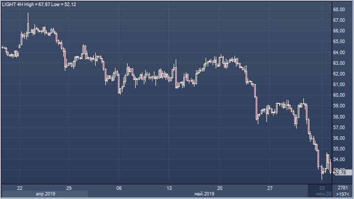 Котировки на рынке нефти снижаются на американских торгах в понедельник 3 июня. Brent падает на 1.25% до $60.74 за баррель, при этом WTI дешевеет на 1.33% до $52.80 за баррель.